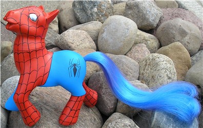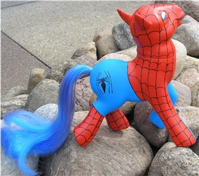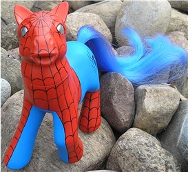 ![]() ![]() ![]() | Hier kommt Spiderman! Ich mag Spiderman sehr und darum wollte ich ihn gern mal als Pony machen. Ich habe versucht sein Kostüm dem Pony anzupassen. Es geht sogar bis unter die Hufe, ganz wie bei Spidey eben - ein hautenger Komplettanzug ;) Die Spinne fand dann auf seinen Po-Backen ein neues zu Hause. Die Mähne ist gut unter dem Anzug versteckt, nur der Schweif schaut heraus. Man darf ihn ja nicht so leicht erkennen! Bemalt hab ich ihn mit Acrylfarben. |