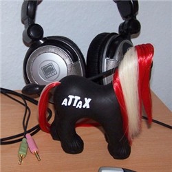 ![]() ![]() ![]() | ATTAX Idee: Alternate ATTAX, ein deutscher Counter-Strike-Clan (wurde Ende 2006 Weltmeister!) ATTAX ist klar ein männliches Pony. Sein Hobby ist es pausenlos am PC zu sitzen und Counter-Strike zu daddeln. Er vergöttert den Clan "Alternate ATTAX" und deren Logo ist sein Symbol. Seine Haare sind Rot und Nachtleucht (als guter Zocker braucht er so kein weiteres Licht das auf dem Monitor blenden würde). |
