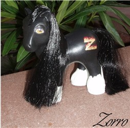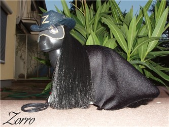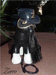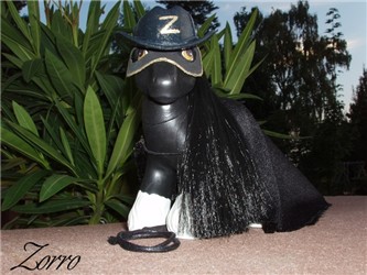![]() ![]() ![]() ![]() | Zorro Zorro war in seinem früheren Leben mal Chief, der leider sehr vergilbt war und Bekanntschaft mit einer Schere gemacht hat. Er ist mit Acrylfarbe bemalt und hat glatte Haare aus dem Afroshop bekommen. Er hat auch ein Kostüm, das besteht aus einem Hut (war mal Tex seiner, nur meinte ein Kind es wäre toll ihn zu bemalen), einer Augenbinde, einem Mantel und einer Peitsche (aus verschiedenen Schwarzgefärbten Baumwollstoffen) |
