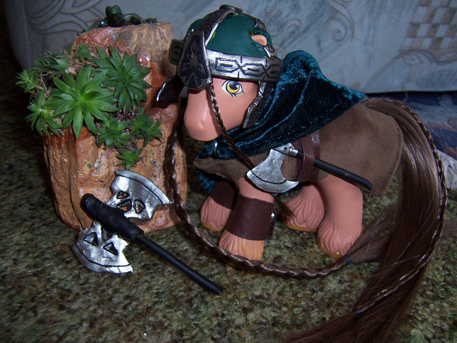 ![]() | Tungdil Goldhuf Materialien: ein gedemütigter Chief, Fimo, brauner Stoff, etwas Leder, Samt in grün, Druckknöpfe, Nähgarn und Nadel. Diverse Acrylfarben. Name: Tungdil Goldhuf Hallo, ich bin Tungdil Goldhuf, und wohne bei den Zwergen. Wie das kommt? Nun.. jeder kennt doch von euch sicher den ersten Teil vom Herrn der Ringe, oder? Und sicher jeder weiß, das da auch ein Pony drin vor kam. Tja, das war ich. Meine Gefährten ließen mich zwar frei, aber ich hatte einen von ihnen besonders gern. Gimli den Zwerg. Ich folgte ihnen lange heimlich. Auch als Gimli heimkehrte, ich war dabei, und schlich im sogar bis in seine Behausung nach. Ich machte mir einen riesen Spaß daraus, mir öfter seine Kleider überzuwerfen, ohne das er mich jemals bemerkte. Nur einmal.. da hat ich mich gerade gewandet, da entdeckte ich in einem seiner Humpen etwas Met.. Oje.. wie das Zeug in den Kopf steigt!! Ich wurde seeeehr schläfrig.. und als ich aufwachte stand der Herr der Kleider vor mir.. und guckte nicht recht schlecht. Aber irgendwie brachte er es nicht fertig mich wegzuschicken. Ja, er schmiedete mir sogar meine goldenen Hufeisen, und benannte mich nach einem Schwager.. .. Gott, weiß nicht wievielten Grades. Das ist bei Zwergen teilweise sehr vertrackt. Auch bekam ich einen Helm der dem seinen recht ähnlich sieht. Nur eben mit Ohrlöchern. Seit dieser Zeit sind wir eigentlich unzertrennlich, und wenn er doch mal wieder zuuu müde ist um etwas weiter zu laufen.. er hat ja mich ;-), seinen Tungdill Goldhuf ^^. |