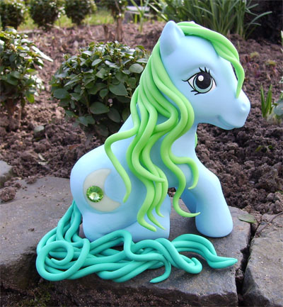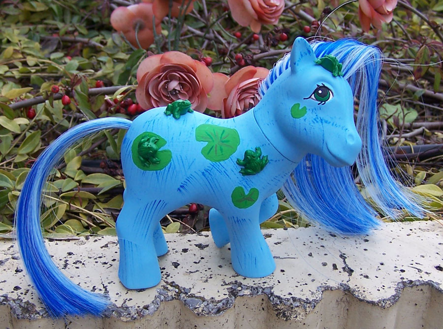 ![]() | Froschteich Bemalt wurde Froschteich mit matter Acrylfarbe (zwei verschiedene Blautöne und drei verschiedene Grüntöne). Die neuen Haare sind Nylon-Haare von Custompony.com in den Farben Frosty Ice und Blueberry Pie. Auf Froschteich leben 5 kleine, grüne Plastikfrösche (zwei auf der DS, einer auf dem Rücken, einer auf dem Kopf und einer auf der NDS). Die kleinen Frösche und Froschteich sind so gut befreundet, dass sie kleinen Frösche Froschteich vertrauen, auch wenn Froschteich mal das sichere Froschtümpelgebiet verlässt um Freunde zu besuchen. Da gehen die kleinen Frösche dann einfach mit und lassen sich die vielen Leckereien bei Froschteichs Freunde schmecken. |