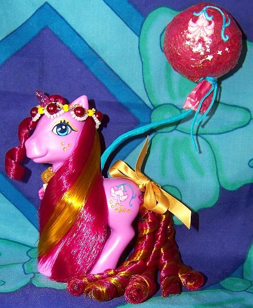 ![]() | Shiny Mayflower war ursprünglich eine G3 Lily Lightly. Ihren Umhang habe ich vorsichtig entfernt, ohne die Kabel mit den Lämpchen zu beschädigen. Ich bastelte mit Hilfe eine kleinen Luftballons einen Papierballon aus Transparentpapier und Tapetenkleister. Nach Trocknen des Kleisters entfernte ich den echten Luftballon wieder aus dem Inneren des Papierballons und zeichnete die Symbolblüte auf den Ballon, geschmückt mit etwas Goldglitzer. Vorsichtig steckte ich nun die kleinen Lämpchen in den Ballon und befestigte sie im Inneren mit Klebstoff.Dann nahm ich einen stabilen gebogenen Draht und steckte das eine Ende in den Ponyrücken, dort wo die Kabel rauskamen. Das andere Ende klebte ich im Ballon fest. Draht + Kabel umwickelte ich mit weichem Klebeband und malte diese "Ballonschnur" nun türkis an. Rehaired wurde Shiny Mayflower mit MLP-Dollyhair (Venom + Golden Goddess). Anschließend bekam sie in den Schweif und in die Stirnsträhne noch Locken. Ihre "Krone" wurde aus kleinen und großen Bastelperlen gefertigt. Ihr Symbol auf dem Po und ihre Wange wurden noch verziert mit kleinen goldgelben Glitzersteinchen und im Schweif hat sie auch eine goldgelbe Schleife. Durch Drücken auf den Sternknopf an ihrer Brust leuchtet nun ihr Horn blau und der Ballon abwechselnd in rot und blau. Leider sind die Leuchtbilder etwas unscharf weil ich nicht mit Blitz knipsen konnte...Sonst hätte man das Leuchten nicht gesehen, wenn ich geblitzt hätte. Aber man kann erkennen, was wichtig ist ;-) |