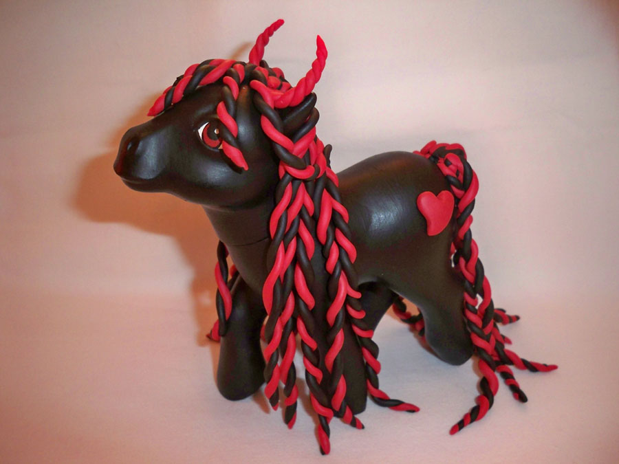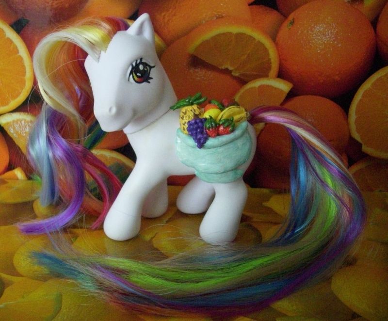![]() | Cutie Fruity ist aus einer vom Flohmarkt geretteten aber nicht mehr so schönen Frilly Frocks entstanden. Das Symbol wurde komplett modelliert, mit Acrylfarben bemalt und anschließend mit Glossfinish überpinselt. Die Schale wurde zusätzlich noch mit einem leichten Perlmuttschimmer versehen. Anschließend hat Cutie Fruity noch eine kunterbunte Regenbogenm?hne bekommen, die insgesamt aus 25 verschiedenen Farben besteht. Zu guter Letzt habe ich ihr noch Regenbogenaugen verpasst und fertig war das süße Früchtchen. |