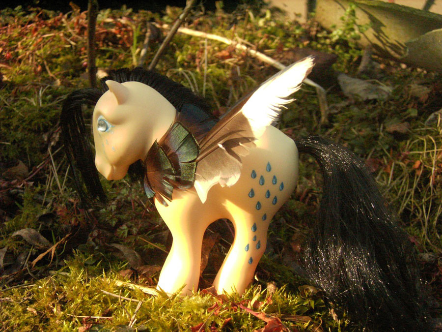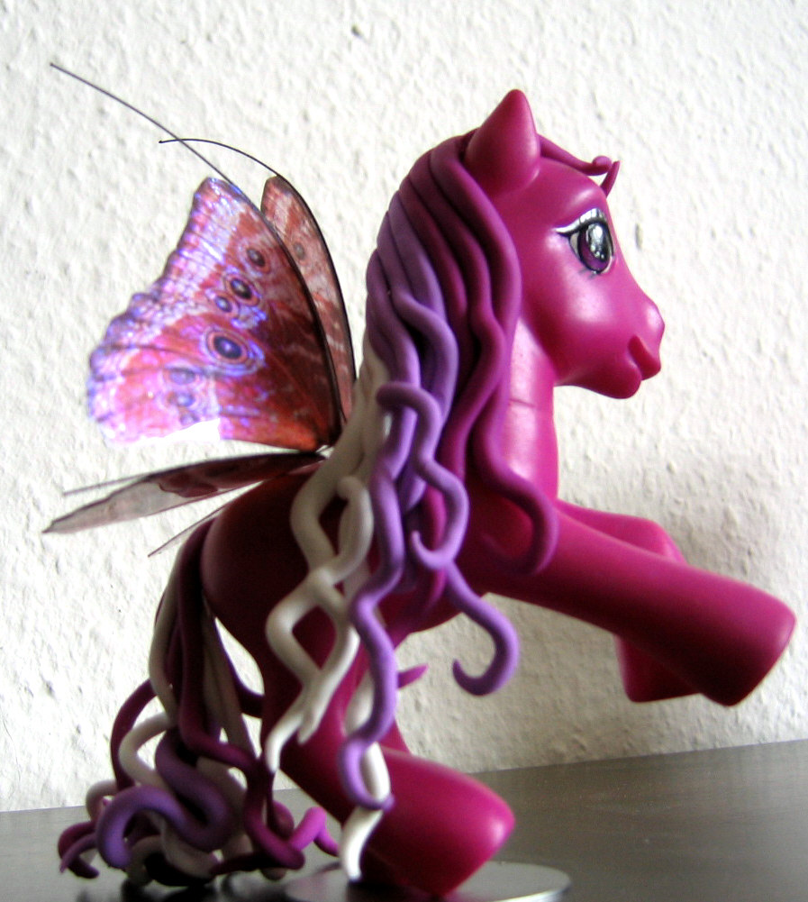 ![]() | Vibrant Sky Ich wollte schon länger einen Schmetterling mit einigermaßen naturgetreuen Flügeln machen. Die steigende Pose bot sich da für mich an, da es so zumindest angedeutet so aussieht, als würde das Pony wirklich fliegen. Das Gestalten der Flügel hätte ich mir dann aber doch etwas einfach vorgestellt als es letztendlich war. Der Draht mit Nylon- Ummantelung wollte nicht so recht halten und die Flügel haben sich immer wieder verselbstständigt. Hergestellt sind sie aus einem Sandwich aus OHP-Folie+Angelina Film+OHP-Folie. Das schimmern des Angelina Films lässt sich leider auf einem Foto schlecht darstellen. In Wirklichkeit schimmern sie in verschiedenen Lila- und Purpurtönen bis hin zu grün. Ansatzweise ist es auf einigen Bildern leicht zu erkennen. Augen und Körper sind mit Acrylfarben verschiedener Hersteller ge-/bemalt und die Haare sind aus Fimo. |