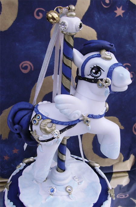 ![]() | Skywishes Die Idee ein Karusellpony, so richtig mit Karusellstange und allem drum und dran, zu custen bestand jetzt schon seit Jahren, aber irgendwie hat es bisher immer an der zündenden Idee der Ausführung gefehlt. Vor ein paar Monaten bin ich dann, in den unergründlichen Tiefen meines riesigen Bastelbestandes, über diese Spieluhrendose mit Drehscheibe gefallen. Ich weiß nicht wie alt sie schon ist, aber ich tippe auf zehn Jahre ^^. Diese Spieluhren wurden damals extra hergestellt um darauf mit Fimo zu arbeiten. Die Drehscheiben sind Fimotemperatur hitzebeständig. Soviel war mir noch klar *lacht* Und damit war dann auch die Idee geboren. Ein Karusell Custom mit Mond und Sternen, passend zur dunkelblauen Farbe der Spieldose. Das Pony auf der Drehscheibe war fertig, als ich auf die wunderliche Idee kam, dass die Spieldose so leer ausschaut und das dort auch noch was hin müsse. Gut.... aber ist die Dose auch Hitzebeständig, so wie die Scheibe? Da ich nicht mit Apoxie arbeiten wollte (ich hasse das Zeugs) hab ich es eben versucht, und... es ist gründlich in die Hose gegangen... Nach ca 10min im Ofen hat sich das Unterteil angefangen zu verbiegen und die Fimo Bordüre ist in Kleinteile zerfallen! Nun gut, also zu plan B. Zweite (zum Glück) vorhandene Spieldose rausgekramt, und die Bruchstücke dort aufgeklebt. Fehlende Teile mit Apoxie (bwaaah) ausgebessert, bemalt, endlich fertig :D Genutze Materialien sind Acryl Farben, Fimo, Holzstab, Draht, Swarovski Steinchen, ein Glöckchen, Bänder, Nagellack und Apoxie Sculpt.- |