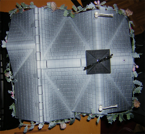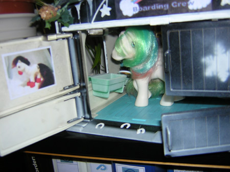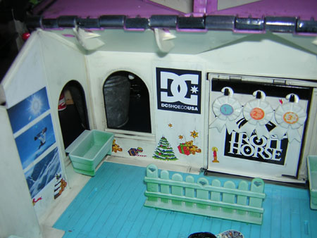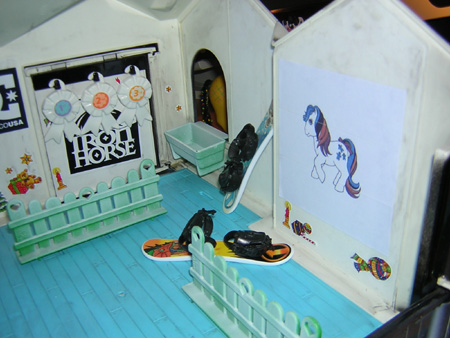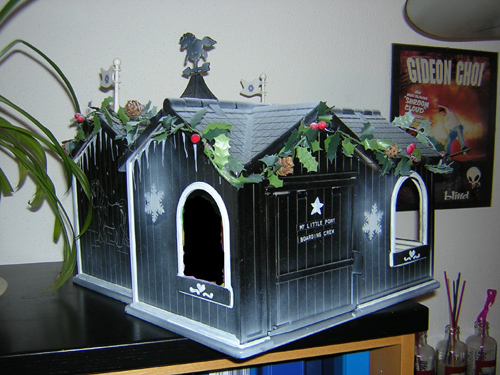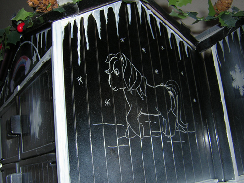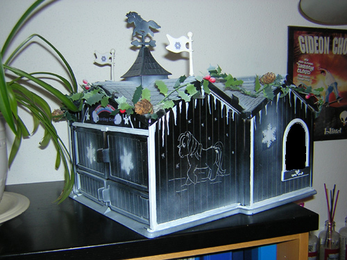 das haus sollte so was wie eine skihütte bei nacht darstellen, da ich der meinung war, der schnee würde auf schwarzem untergrund einfach besser wirken. ich hab in einer fiselarbeit eine schneeflockenschablone gemalt und ausgeschnitten, und sie dann auf die wände des hauses aufgesprüht. ausserdem hab ich die highlights, die schon im plastik des originalhauses vorhanden waren, mit weissem lack hervorgehoben. ans dach habe ich eine blätter/tannenzapfen/rote beeren - kette geklebt, und wenn man genau hinguckt, hängen unterm dach ein paar eiszapfen! ; ) das pickerl "pony haus" hab ich durch ein schwarzes pickerl "pony boarding crew" ersetzt. die Fahnen am dach zeigen eine weiss/schwarze schneeflocke. beim eingang des hauses sieht man ein paar schnee-hufabdrücke. die zäune des hauses hab ich weiss angesprüht und innen als wände bzw ständer für die minisnowboards verwendet. ausserdem kleben innen ein paar snowboardbilder und pony- und weihnachtsbilder. dort, wo die siegerschleiften hängen, kann man auch toll die miniboards aufhängen! ; ) eigentlich wollte ich das ganze im schnee draussen fotografieren, aber zuerst war da keiner, und dann wars zu viel, so dass das haus gänzlich eingesunken wäre..!